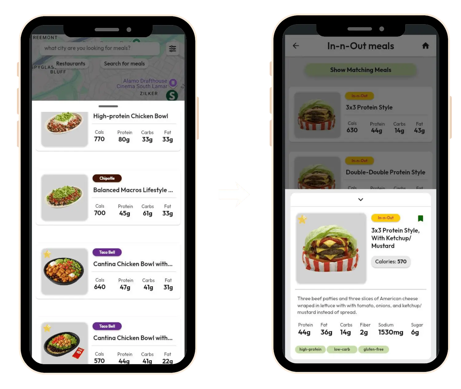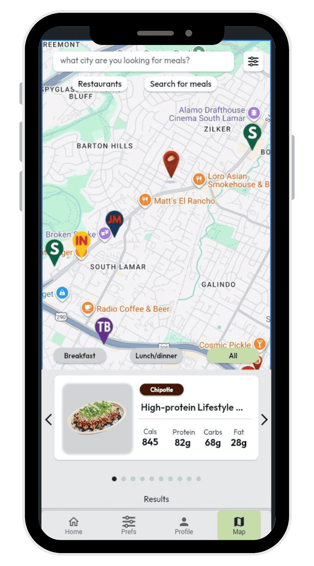 FitMeals instantly locates restaurant meal options near you that meet your desired lifestyle goals, protein, fat, and carb targets (and fiber!)—plus, it includes a large database of off-menu custom meal hacks! All of which are macro friendly and hand designed by a ceritifed nutrition coach to be the better-for-yoou option. Launches January 2026!