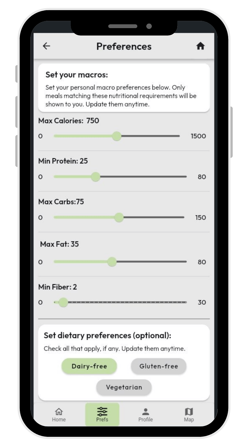 That's it! FitMals will instantly filter and display a list of meals from nearby restrautants that fit your healthy eating goals.